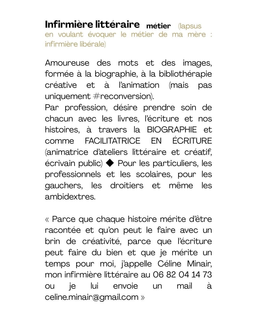 Infirmière littéraire, c’est de la haute couture professionnelle, c’est mon métier sur-mesure. Avec moi, pas de schéma rigide, je vous propose une infinité de possibilités pour vous raconter, du sur-mesure aussi mais pour vous, parce que chaque histoire est unique.